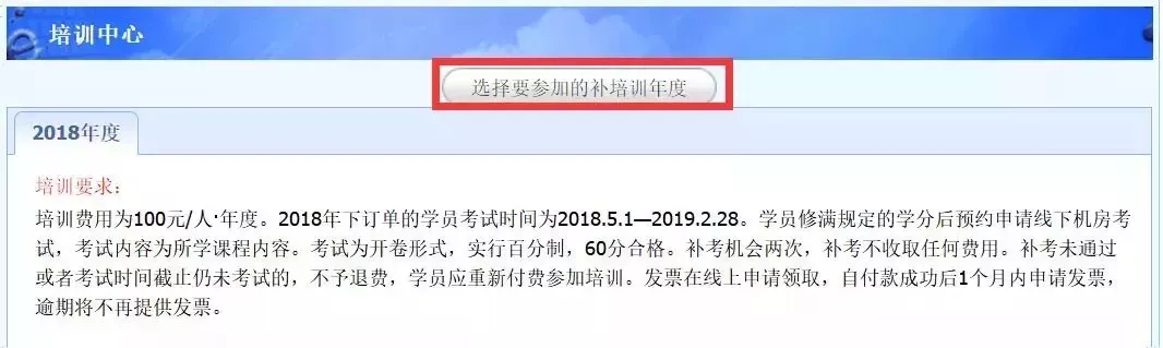 2)若需要參加以往年度的補(bǔ)培訓(xùn),請(qǐng)點(diǎn)擊“選擇要參加的補(bǔ)培訓(xùn)年度”按鈕選擇相應(yīng)的培訓(xùn)年度。
