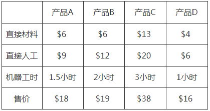 2、公司有4種產(chǎn)品,各種產(chǎn)品的成本和售價(jià)的信息如下:
