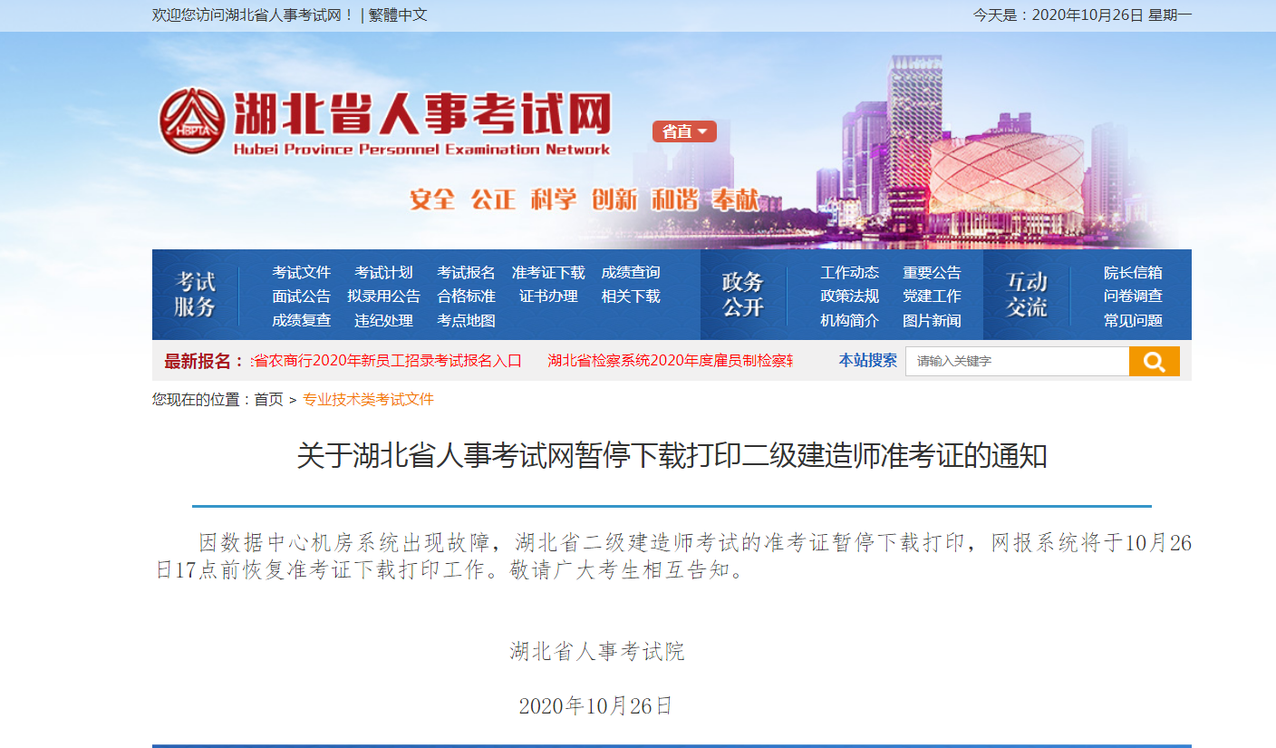 因數(shù)據(jù)中心機(jī)房系統(tǒng)出現(xiàn)故障,湖北省二級(jí)建造師考試的準(zhǔn)考證暫停下載打印,網(wǎng)報(bào)系統(tǒng)將于10月26日17點(diǎn)前恢復(fù)準(zhǔn)考證下載打印工作。敬請(qǐng)廣大考生相互告知。