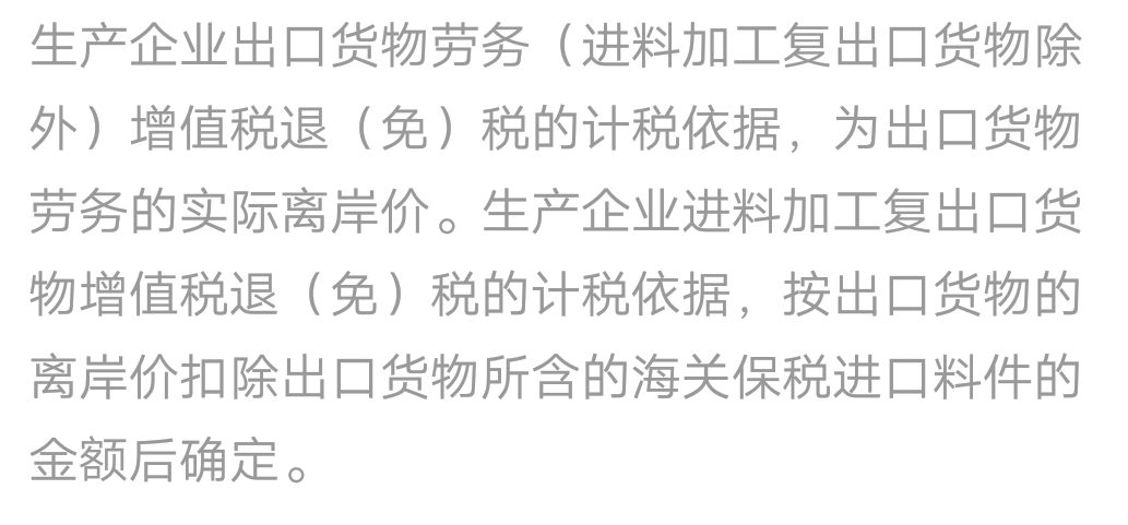 第一句話就是按照離岸價(jià)格作為計(jì)稅依據(jù),您不太理解的是第二句話吧。進(jìn)料加工復(fù)出口是指生產(chǎn)企業(yè)把材料從國(guó)外運(yùn)進(jìn)來(lái)之后,加工成產(chǎn)成本再運(yùn)往國(guó)外銷(xiāo)售。因?yàn)樯a(chǎn)產(chǎn)品要交稅,所以在材料運(yùn)進(jìn)來(lái)的時(shí)候是沒(méi)有交稅的。那在計(jì)算出口貨物的退稅的時(shí)候,也不能把沒(méi)交過(guò)的稅再退給你,所以要用貨物的離岸價(jià)減去進(jìn)口材料的價(jià)格。