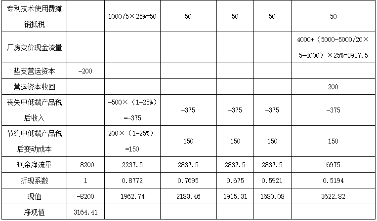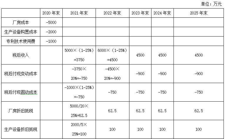 題干:甲公司是一家中低端護(hù)膚品生產(chǎn)企業(yè),為適應(yīng)市場(chǎng)需求,2020年末擬新建一條高端護(hù)膚品生產(chǎn)線,項(xiàng)目期限5年。相關(guān)資料如下:(1)新建生產(chǎn)線需要一棟廠房、—套生產(chǎn)設(shè)備和一項(xiàng)專利技術(shù)。新建廠房成本5000萬(wàn)元,根據(jù)稅法相關(guān)規(guī)定,按直線法計(jì)提折舊,折舊年限20年,無(wú)殘值。假設(shè)廠房建設(shè)周期很短,2020年末即可建成使用,預(yù)計(jì)5年后變現(xiàn)價(jià)值4000萬(wàn)元。生產(chǎn)設(shè)備購(gòu)置成本2000萬(wàn)元,無(wú)需安裝,根據(jù)稅法相關(guān)規(guī)定,按直線法計(jì)提折舊,折舊年限5年,無(wú)殘值,預(yù)計(jì)5年后變現(xiàn)價(jià)值為零。一次性支付專利技術(shù)使用費(fèi)1000萬(wàn)元,可使用5年,根據(jù)稅法相關(guān)規(guī)定,專利技術(shù)使用費(fèi)按受益年限平均攤銷。(2)生產(chǎn)線建成后,預(yù)計(jì)高端護(hù)膚品第一年銷售收入5000萬(wàn)元,第二年及以后每年銷售收入6000萬(wàn)元。付現(xiàn)變動(dòng)成本占銷售收入的20%,付現(xiàn)固定成本每年1000萬(wàn)元。(3)項(xiàng)目需增加營(yíng)運(yùn)資本200萬(wàn)元,于2020年末投入,項(xiàng)目結(jié)束時(shí)收回。(4)項(xiàng)目投產(chǎn)后,由于部分原中低端產(chǎn)品客戶轉(zhuǎn)而購(gòu)買高端產(chǎn)品,預(yù)計(jì)會(huì)導(dǎo)致中低端產(chǎn)品銷售收入每年流失500萬(wàn)元,同時(shí)變動(dòng)成本每年減少200萬(wàn)元。(5)假設(shè)廠房、設(shè)備和專利技術(shù)使用費(fèi)相關(guān)支出發(fā)生在2020年末,各年?duì)I業(yè)現(xiàn)金流量均發(fā)生在當(dāng)年年末。(6)項(xiàng)目加權(quán)平均資本成本14%。企業(yè)所得稅稅率25%。