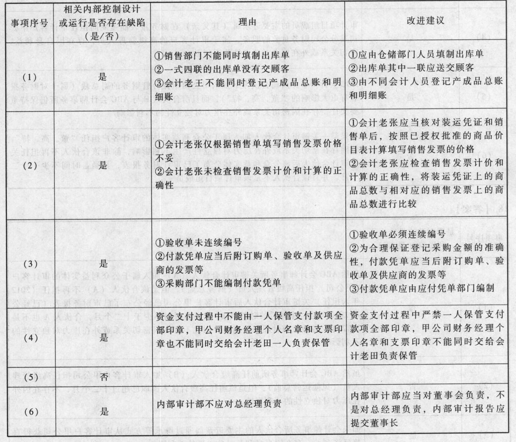 題目:假定未描述的其他內(nèi)部控制不存在缺陷,請(qǐng)指出甲公司以上事項(xiàng)(1)至(6)的內(nèi)部控制設(shè)計(jì)或運(yùn)行中是否存在缺陷,如果存在缺陷,請(qǐng)分別說(shuō)明理由并指正。將答案填入下表: