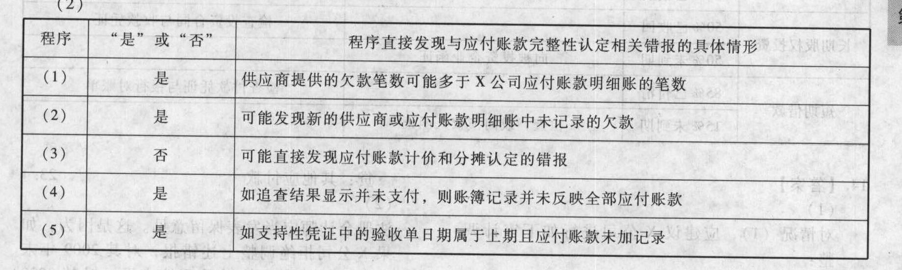 參考答案(1)表明采購與付款交易存在重大錯(cuò)報(bào)風(fēng)險(xiǎn);管理層存在低估應(yīng)付賬款的偏好與動(dòng)機(jī);重大錯(cuò)報(bào)風(fēng)險(xiǎn)與應(yīng)付賬款的完整性、計(jì)價(jià)和分?jǐn)傉J(rèn)定相關(guān)。