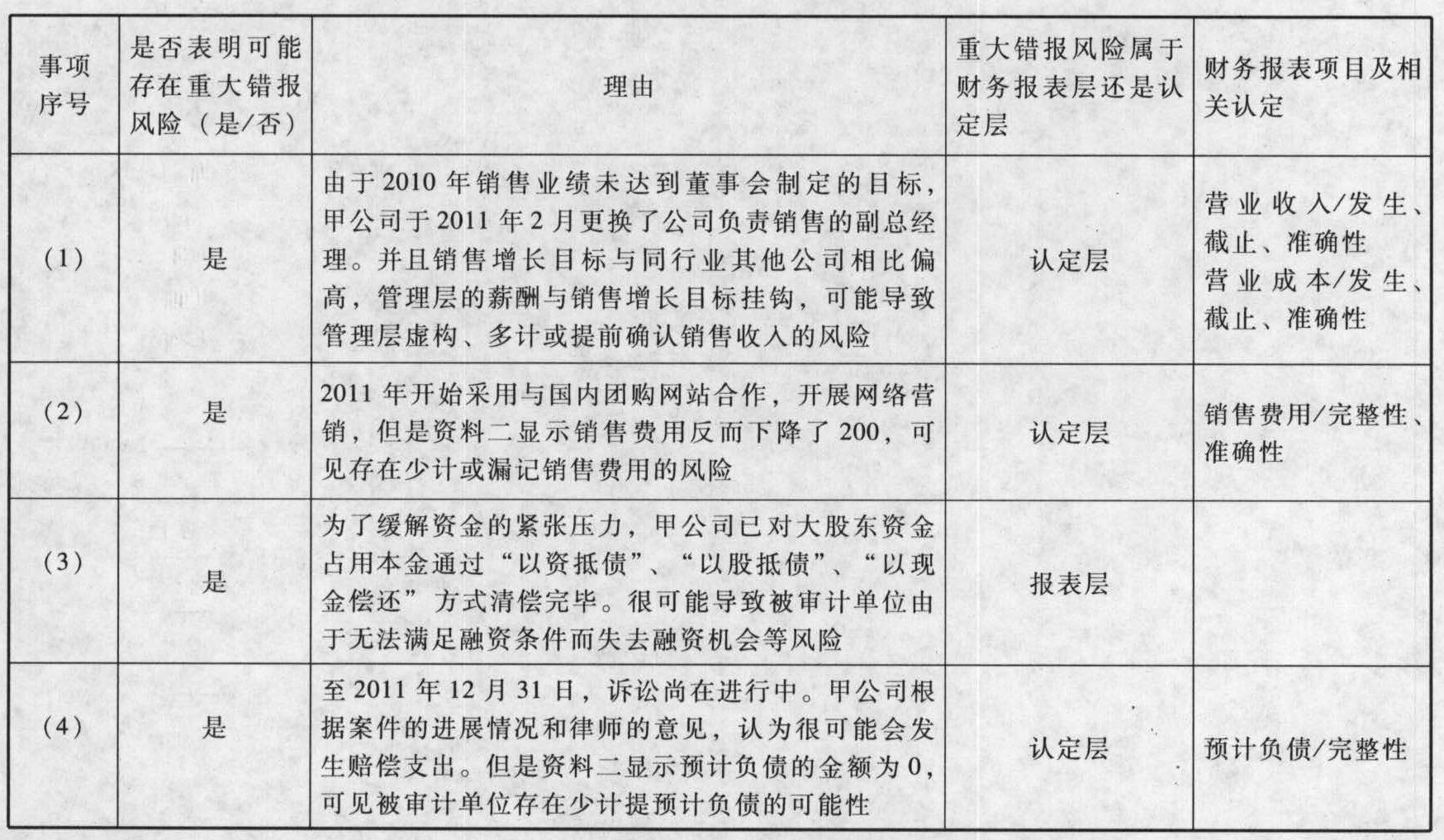題目:針對(duì)資料-(1)至(4)項(xiàng),結(jié)合資料二,假定不考慮其他條件,逐項(xiàng)指出資料一所述事項(xiàng)是否可能表明存在重大錯(cuò)報(bào)風(fēng)險(xiǎn)。如果認(rèn)為存在,簡(jiǎn)要說(shuō)明理由,并說(shuō)明財(cái)務(wù)報(bào)表層次的重大錯(cuò)報(bào)風(fēng)險(xiǎn)還是認(rèn)定層的重大錯(cuò)報(bào)風(fēng)險(xiǎn),如果是認(rèn)定層的重大錯(cuò)報(bào)風(fēng)險(xiǎn)分別說(shuō)明該風(fēng)險(xiǎn)主要與哪些財(cái)務(wù)報(bào)表項(xiàng)目(僅限于營(yíng)業(yè)收入、營(yíng)業(yè)成本、銷售費(fèi)用和預(yù)計(jì)負(fù)債)的哪些認(rèn)定相關(guān)。