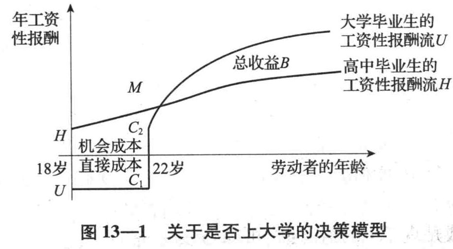 本題考查上大學(xué)的機(jī)會(huì)成本。在M點(diǎn)之前,大學(xué)畢業(yè)生所承擔(dān)的接受高等教育的成本則包括兩部分,一部分是直接支出的學(xué)費(fèi)以及其他與接受高等教育直接相關(guān)的成本,即圖中的直接成本C1部分,此外,大學(xué)畢業(yè)生由于接受高等教育,一方面導(dǎo)致在最初的四年中因無法工作而損失了四年的工資性報(bào)酬,另一方面,還有可能因?yàn)閯傞_始工作時(shí)繼續(xù)接受培訓(xùn)等原因而導(dǎo)致工資性報(bào)酬在最初的一年或幾年中低于已經(jīng)有幾年工作經(jīng)驗(yàn)的高中畢業(yè)生。嚴(yán)格來說,這兩部分成本都屬于接受高等教育的機(jī)會(huì)成本,即圖中的C2區(qū)域。