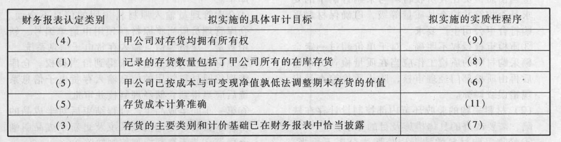 題干:甲公司是一家專營(yíng)空調(diào)的生產(chǎn)與銷售型上市公司。A注冊(cè)會(huì)計(jì)師擔(dān)任甲公司2013年度財(cái)務(wù)報(bào)表審計(jì)業(yè)務(wù)的項(xiàng)目合伙人。在實(shí)施風(fēng)險(xiǎn)評(píng)估程序后,A注冊(cè)會(huì)計(jì)師評(píng)估存貨的控制風(fēng)險(xiǎn)為高水平,確定存貨項(xiàng)目為重點(diǎn)審計(jì)領(lǐng)域,同時(shí)決定根據(jù)財(cái)務(wù)報(bào)表認(rèn)定確定存貨項(xiàng)目的具體審計(jì)目標(biāo),并選擇相應(yīng)的具體審計(jì)程序以保證審計(jì)目標(biāo)的實(shí)現(xiàn)。