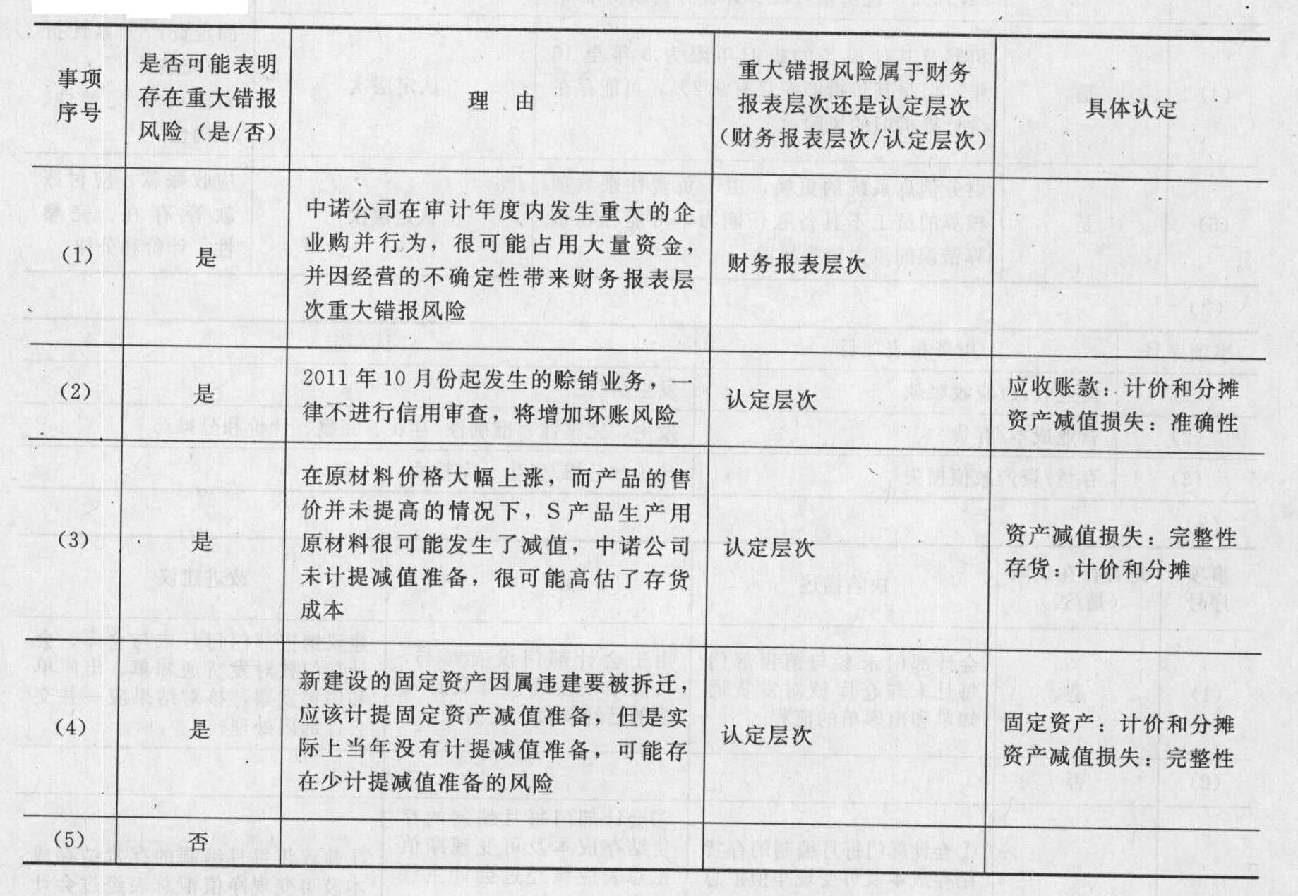 - 綜合題(主觀)ABC會計事務(wù)所接受委托,對中諾股份有限公司(以下簡稱中諾公司)2011年度財務(wù)報表實施審計業(yè)務(wù)。中諾公司主要從事產(chǎn)品的生產(chǎn)和銷售,銷售方式以賒銷為主。A和B注冊會計師于2012年1月20日進駐中諾公司,2月1日完成審計工作,2月5日編制完成了審計報告。 資料一:A和B注冊會計師在審計過程中注意到如下情況: (1)為拓展業(yè)務(wù),中諾公司出資4000萬元于2011年末收購了東北某省的一家生產(chǎn)企業(yè),并進一步計劃兩年內(nèi)在東北形成完整的經(jīng)銷、零售產(chǎn)業(yè)鏈,全面進軍東北市場。 (2)為改善銷售業(yè)績,在行業(yè)內(nèi)占有更具有競爭優(yōu)勢的銷售份額,2011年10月份起,中諾公司分管銷售的副總經(jīng)理親自參與銷售部分的工作,以誘人的優(yōu)惠賒銷政策吸引新、老客戶,對于此后發(fā)生的賒銷業(yè)務(wù),一律不進行信用審查。 (3)中諾公司生產(chǎn)的S產(chǎn)品為其主要產(chǎn)品,從2011年初開始,原材料價格上漲了50%,中諾公司考慮到市場競爭的加劇,沒有提高S產(chǎn)品的售價,年末未對庫存的生產(chǎn)用原材料計提存貨跌價準(zhǔn)備。 (4)中諾公司于2011年7月完工投入使用的一個倉庫被有關(guān)部門認(rèn)定為違章建筑,被要求在2012年6月底前拆除,中諾公司未對其計提減值損失。 (5)2011年末,中諾公司的母公司宣布在未來2年內(nèi)將逐步增加對中諾公司的投資。資料二: (1)關(guān)于投資業(yè)務(wù)的重要內(nèi)部控制制度摘要:“投資業(yè)務(wù)要經(jīng)過授權(quán)審批,要與被投資單位簽訂合同、協(xié)議,并獲取被投資單位出具的投資證明”。 (2)關(guān)于采購業(yè)務(wù)的重要內(nèi)部控制制度摘要:“采用適當(dāng)?shù)臅嬁颇勘?;一收到商品或接收勞?wù)就記錄采購業(yè)務(wù)”。 (3)關(guān)于銀行存款業(yè)務(wù)的重要內(nèi)部控制制度摘要:“每月月末定期取得銀行對賬單并編制銀行存款余額調(diào)節(jié)表”。 要求: (1)針對資料一,完成下表:
