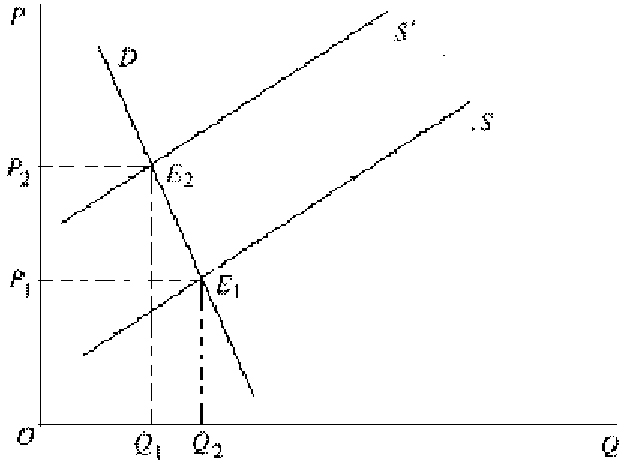 如圖所示,農(nóng)產(chǎn)品的需求曲線D是相對無彈性的,即比較陡峭。農(nóng)產(chǎn)品的減產(chǎn)使供給曲線由S向左移動至S',在缺乏彈性的需求曲線的作用下,農(nóng)產(chǎn)品的均衡價格大幅度地由原先的P1上升到P2。由于農(nóng)產(chǎn)品均衡價格的上升幅度大于農(nóng)產(chǎn)品均衡數(shù)量的下降幅度,最后致使農(nóng)民收入增加。