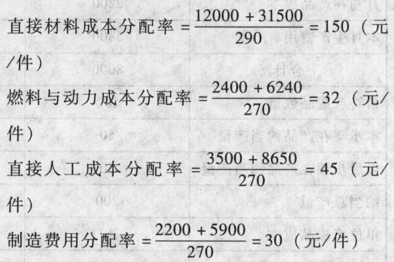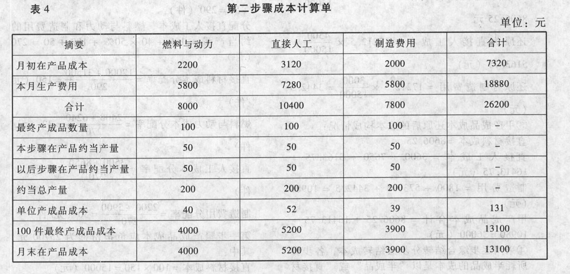 第二步驟產(chǎn)成品成本應(yīng)負(fù)擔(dān)份額為13100元,其中:燃料與動(dòng)力成本=100×40=4000(元)直接人工成本=100×52=5200(元)制造費(fèi)用=100×39=3900(元)第二步驟成本計(jì)算單見(jiàn)表4。