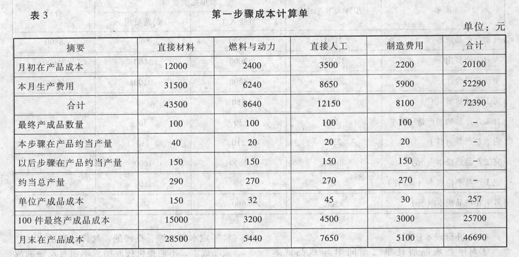第一步驟產(chǎn)成品成本應(yīng)負(fù)擔(dān)份額為25700元,其中:直接材料成本=100×150=15000(元)燃料與動(dòng)力成本=100×32=3200(元)直接人工成本=100×45=4500(元)制造費(fèi)用=100×30=3000(元)第一步驟成本計(jì)算單見(jiàn)表3。