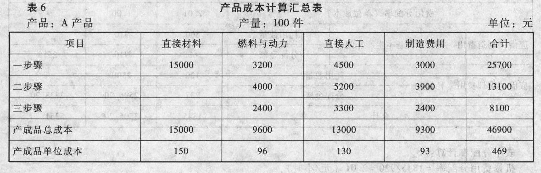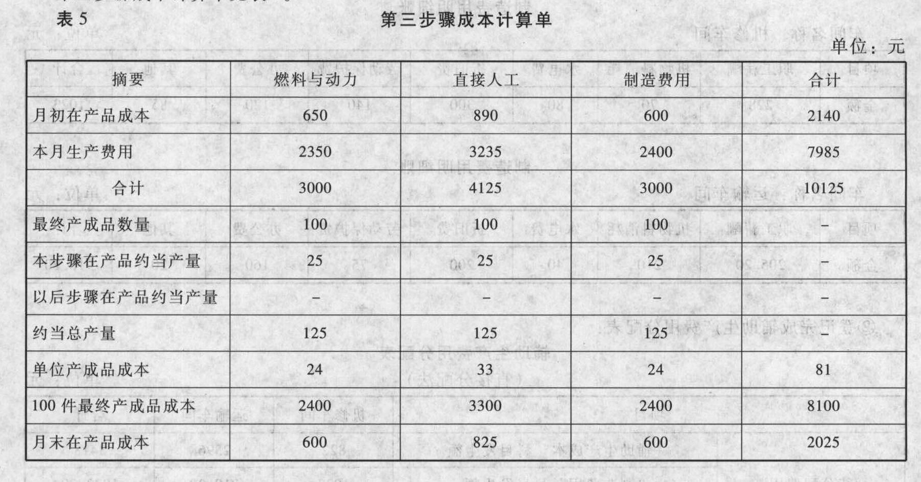 第三步驟產(chǎn)成品成本應(yīng)負(fù)擔(dān)份額為8100元,其中:燃料與動(dòng)力成本=100×24=2400(元)直接人工成本=100×33=3300(元)制造費(fèi)用=100×24=2400(元)第三步驟成本計(jì)算單見(jiàn)表5。
