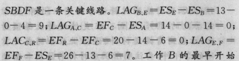 時間為0,所以它也是一個起始工作。根據(jù)從搭接網(wǎng)絡(luò)計劃的終點開始,逆著箭線方向依次找出相鄰兩項工作之間時間間隔為零的線路就是關(guān)鍵線,本題的關(guān)鍵線路只有B→D→F,關(guān)鍵線路上的工作即為關(guān)鍵工作,故本題的關(guān)鍵工作是B工作、D工作和F工作。