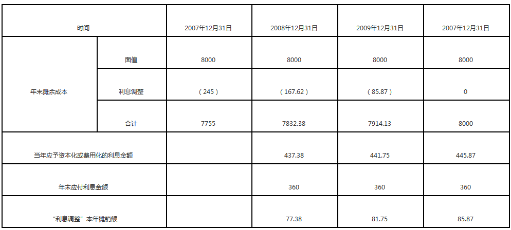 (2)①2007年12月31日發(fā)行債券借:銀行存款 7 755 應(yīng)付債券——利息調(diào)整 245 貸:應(yīng)付債券——面值 8 000 ②2008年12月31日計提利息借:在建工程 437.38(=7755×5.64%) 貸:應(yīng)付債券——利息調(diào)整 77.38 應(yīng)付利息 360 ③2010年12月31日計提利息借:財務(wù)費用 445.87 貸:應(yīng)付債券——利息調(diào)整 85.87 應(yīng)付利息 360 注釋:2009年度的利息調(diào)整攤銷額=(7 755+77.38)×5.64%-8 000×4.5%=81.75(萬元),2010年度屬于最后一年,利息調(diào)整攤銷額應(yīng)采用倒擠的方法計算,所以應(yīng)是=245-77.38-81.75=85.87(萬元) ④2011年1月10日付息還本借:應(yīng)付債券——面值 8 000 應(yīng)付利息 360 貸:銀行存款 8 360