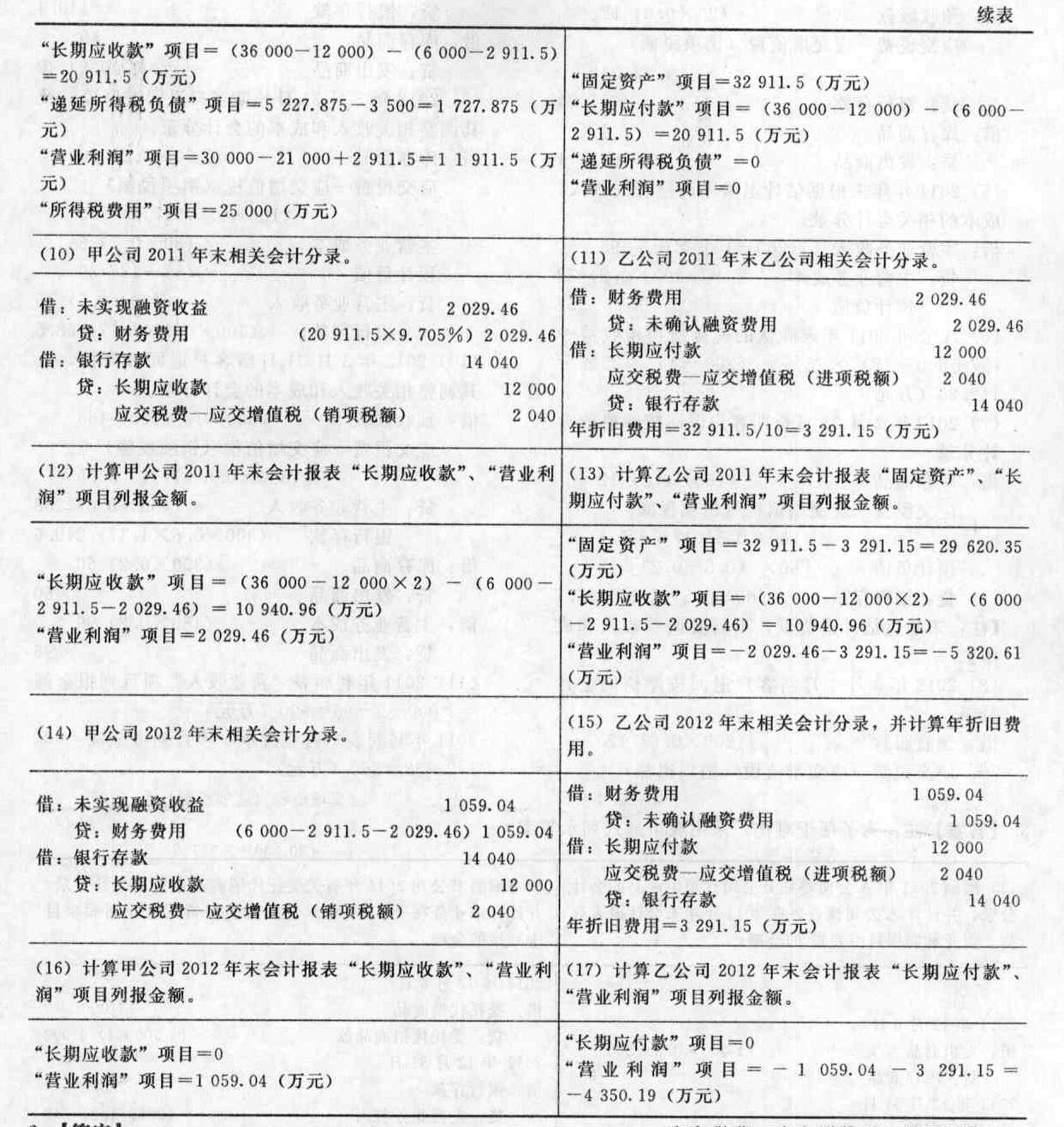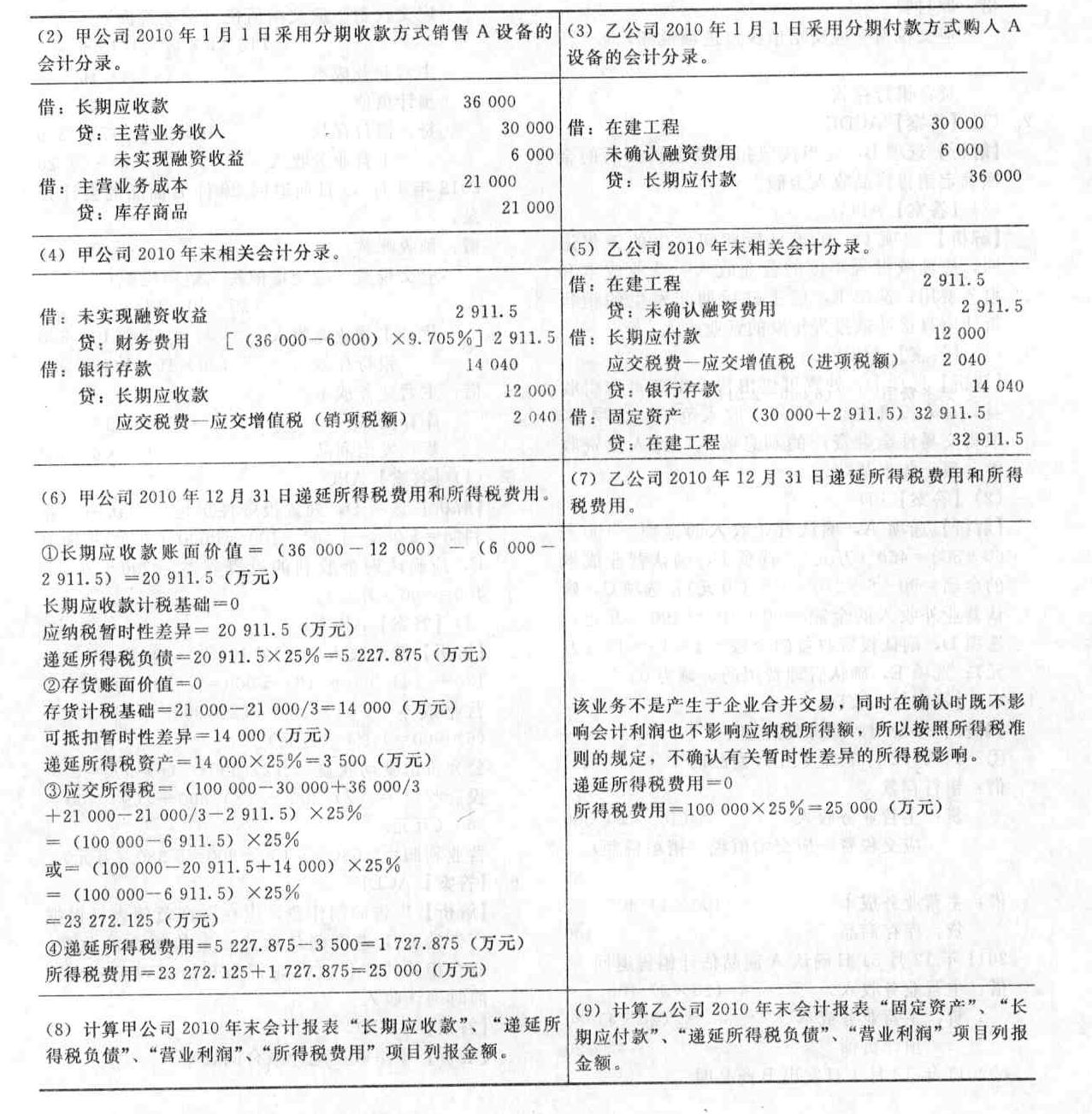 - 綜合題(主觀)甲公司和乙公司均為增值稅一般納稅人,適用的增值稅稅率為17%,所得稅率為25%。甲公司和乙公司有關(guān)經(jīng)濟(jì)業(yè)務(wù)如下。 (1)甲公司于2010年1月1日向乙公司銷(xiāo)售一套A設(shè)備,合同規(guī)定采用分期收款方式銷(xiāo)售該設(shè)備,合同總價(jià)款為36 000萬(wàn)元(含安裝費(fèi)),該價(jià)款分3年于每年年末等額收取。A設(shè)備現(xiàn)銷(xiāo)總價(jià)格為30 000萬(wàn)元(含安裝費(fèi))。當(dāng)日商品已發(fā)出,產(chǎn)品成本為21 000萬(wàn)元。 (2)乙公司于2010年1月1日從甲公司購(gòu)入一套A設(shè)備,合同規(guī)定采用分期付款方式購(gòu)入該設(shè)備,合同總價(jià)款為36 000萬(wàn)元(含安裝費(fèi)),該價(jià)款分3年于每年年末等額支付。A設(shè)備現(xiàn)銷(xiāo)總價(jià)格為30 000萬(wàn)元(含安裝費(fèi))。當(dāng)日收到A設(shè)備并立即投入安裝。2010年12月31日安裝完畢達(dá)到預(yù)定可使用狀態(tài)并交付生產(chǎn)車(chē)間使用。預(yù)計(jì)該設(shè)備的使用年限為10年,凈殘值為0,采用直線法計(jì)提折舊。假定稅法規(guī)定的預(yù)計(jì)使用年限、凈殘值、折舊計(jì)提方法等與會(huì)計(jì)相同。 (3)各年年末甲公司如期收到乙公司支付的貨款,并開(kāi)出增值稅專(zhuān)用發(fā)票。 (4)假定稅法規(guī)定,以分期收款方式銷(xiāo)售貨物的,按照合同約定的收款日期確認(rèn)收入的實(shí)現(xiàn)。 (5)乙公司A設(shè)備各年生產(chǎn)的產(chǎn)品已全部對(duì)外銷(xiāo)售。 (6)假定甲公司和乙公司2010年的會(huì)計(jì)利潤(rùn)均為。100 000萬(wàn)元,除上述事項(xiàng)外,甲公司和乙公司其他會(huì)計(jì)處理與稅法處理不存在差異。 (7)已知:(P/A,9%.3)=2.5313;(P/A,10%,3)=2.4869。 要求: (1)計(jì)算甲公司2010年1月1日采用分期收款方式銷(xiāo)售A設(shè)備的實(shí)際利率。(結(jié)果保留三位小數(shù)) (2)編制甲公司2010年1月1日采用分期收教方式銷(xiāo)售A設(shè)備的會(huì)計(jì)分錄。 (3)編制乙公司2010年1月1日采用分期付款方式購(gòu)入A設(shè)備的會(huì)計(jì)分錄。 (4)編制甲公司2010年末相關(guān)會(huì)計(jì)分錄。 (5)編制乙公司2010年末相關(guān)會(huì)計(jì)分錄。 (6)計(jì)算甲公司2010年12月31日遞延所得稅費(fèi)用和所得稅費(fèi)用。(結(jié)果保留三位小數(shù)) (7)計(jì)算乙公司2010年12月31目遞延所得稅費(fèi)用和所得稅費(fèi)用。 (8)計(jì)算甲公司2010年末會(huì)計(jì)報(bào)表“長(zhǎng)期應(yīng)收款”、“遞延所得稅負(fù)債”、“營(yíng)業(yè)利潤(rùn)”、“所得稅費(fèi)用”項(xiàng)目列報(bào)金額。 (9)計(jì)算乙公司2010年末會(huì)計(jì)報(bào)表“固定資產(chǎn)”、“長(zhǎng)期應(yīng)付款”、“遞延所得稅負(fù)債”、”營(yíng)業(yè)利潤(rùn)”項(xiàng)目列報(bào)金額。 (10)編制甲公司2011年末相關(guān)會(huì)計(jì)分錄。 (11)編制乙公司2011年末相關(guān)會(huì)計(jì)分錄,并計(jì)算年折舊費(fèi)用。 (12)計(jì)算甲公司2011年末會(huì)計(jì)報(bào)表“長(zhǎng)期應(yīng)收款”、“營(yíng)業(yè)利潤(rùn)”項(xiàng)目列報(bào)金額。 (13)計(jì)算乙公司2011年末會(huì)計(jì)報(bào)表“固定資產(chǎn)”、“長(zhǎng)期應(yīng)付款”、“營(yíng)業(yè)利潤(rùn)”項(xiàng)目列報(bào)金額。 (14)編制甲公司2012年末相關(guān)會(huì)計(jì)分錄。 (15)編制乙公司2012年末相關(guān)會(huì)計(jì)分錄,并計(jì)算年折舊費(fèi)用。 (16)計(jì)算甲公司2012年末會(huì)計(jì)報(bào)表“長(zhǎng)期應(yīng)收款”、“營(yíng)業(yè)利潤(rùn)”項(xiàng)目列報(bào)金額。 (17)計(jì)算乙公司2012年末會(huì)計(jì)報(bào)表“長(zhǎng)期應(yīng)付款”、“營(yíng)業(yè)利潤(rùn)”項(xiàng)目列報(bào)金額。