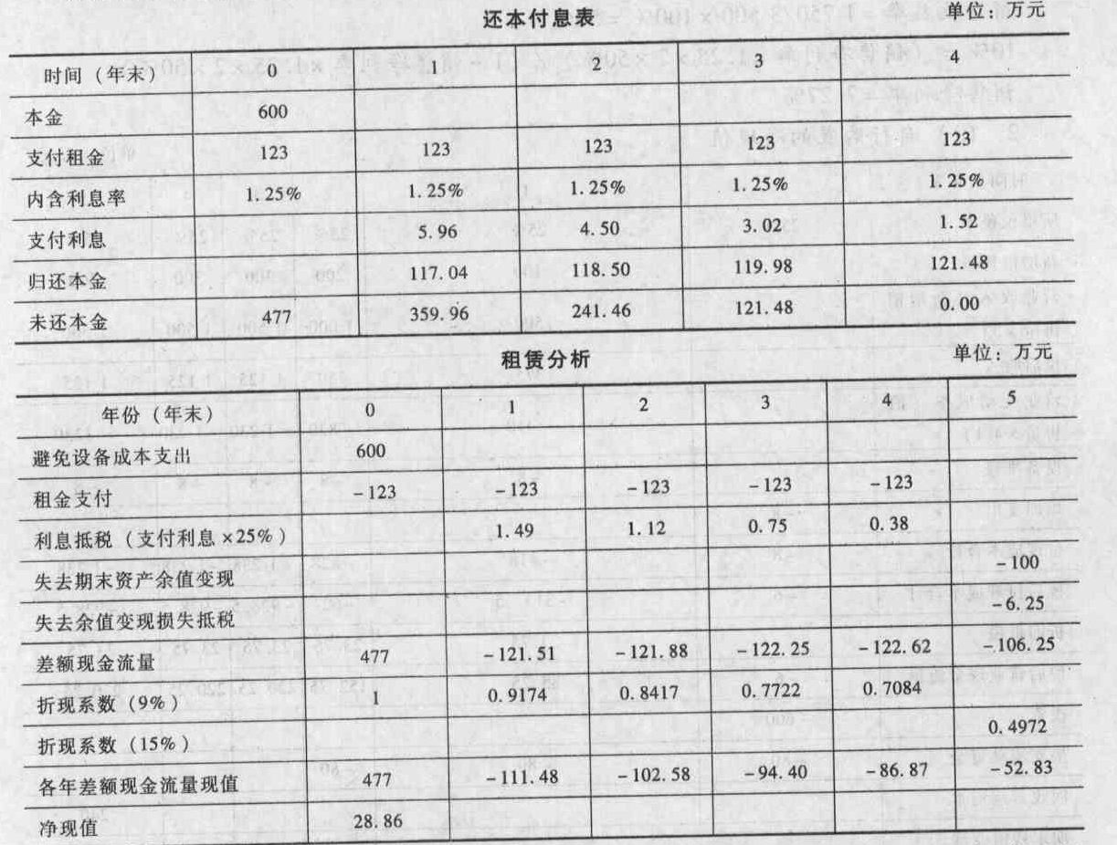 由于租賃方案的凈現(xiàn)值=-74.01+28.86=-45.15(萬(wàn)元),小于零,所以租賃方案也不可行。提示:12%×(1-25%)=9%。