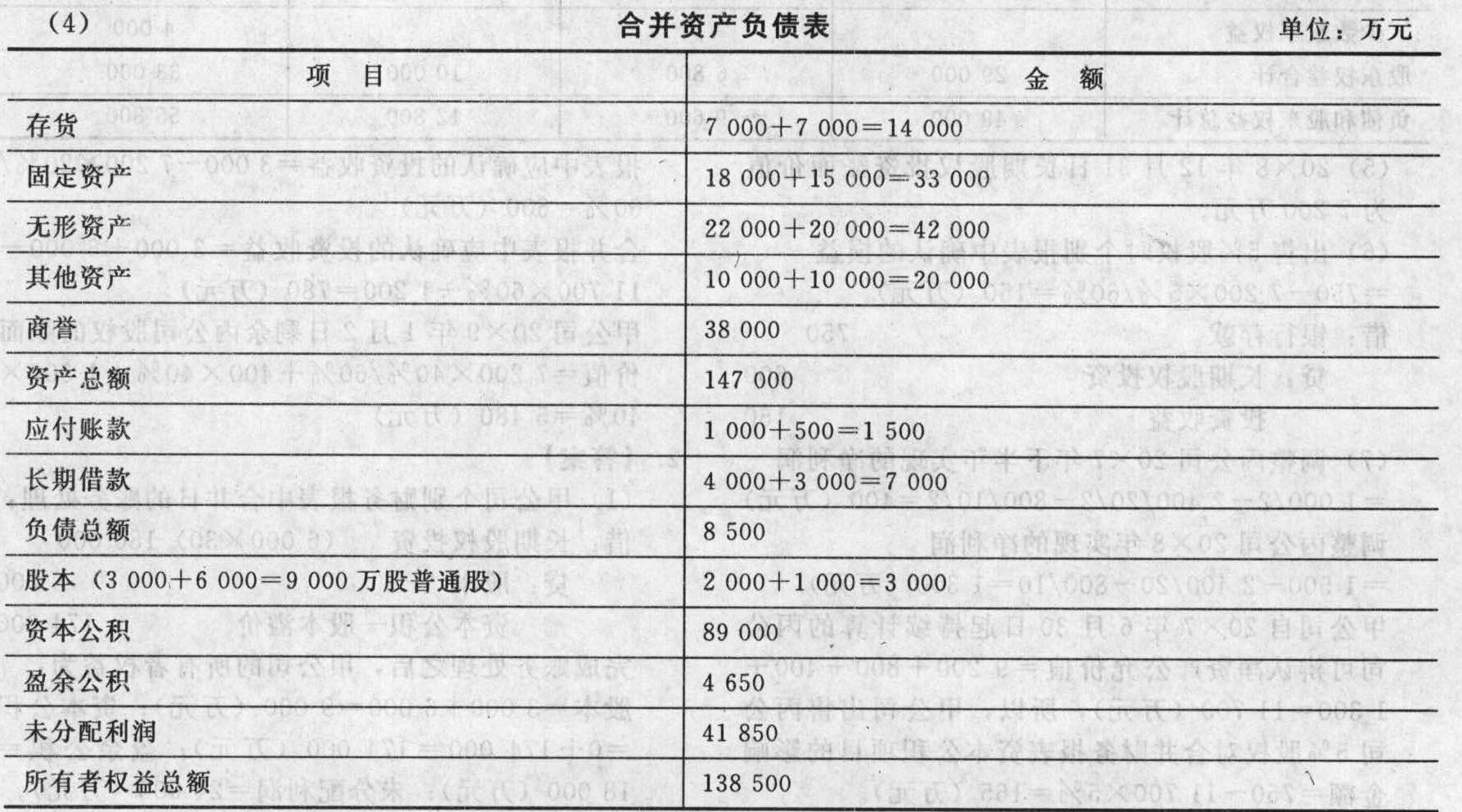 (3)①抵消甲公司對B公司的投資:按照反向購買的處理原則,B公司是會計(jì)上的購買方,所以,要將法律上甲公司購買B公司的賬務(wù)處理進(jìn)行抵消。抵消分錄為:借:股本 6 000資本公積 174 000貸:長期股權(quán)投資 180 000抵消之后,甲公司的所有者權(quán)益恢復(fù)到了合并前的金額:股本=3 000(萬元);資本公積=0(萬元);盈余公積=18 000(萬元);未分配利潤=24 000(萬元),所有者權(quán)益合計(jì)為45 000萬元。②B公司對取得的甲公司投資,采用成本法核算,按照支付合并對價的公允價值作為長期股權(quán)投資的入賬價值,因此,取得投資時虛擬的調(diào)整分錄為:借:長期股權(quán)投資 90 000貸:股本 1 000資本公積89 00【提示】該調(diào)整分錄只出現(xiàn)在合并工作底稿中不是真正的賬務(wù)處理,不記入B公司的賬簿更不記入甲公司賬簿。③甲公司視為被購買方,即會計(jì)上的子公司合并財(cái)務(wù)報表中反映的應(yīng)是甲公司資產(chǎn)和負(fù)債的公允價值,因此,應(yīng)按照公允價值進(jìn)行調(diào)整調(diào)整分錄為:借:存貨 1 000固定資產(chǎn)4 000無形資產(chǎn) 2 000貸:資本公積 7 000調(diào)整后,甲公司可辨認(rèn)凈資產(chǎn)公允價值=45 000+7 000=52 000(萬元)。其中,股本3 000元,資本公積7 000萬元(0+7 000),盈余公積18 000萬元,未分配利潤24 000萬元。④B公司視為購買方,即會計(jì)上的母公司,合并財(cái)務(wù)報表中反映的應(yīng)是B公司資產(chǎn)和負(fù)債的賬面價值。合并商譽(yù)=90 000-52 000=38 000(萬元)。B公司長期股權(quán)投資(虛擬)與甲公司所有者權(quán)益的抵消分錄為:借:股本 3 000資本公積 7 000盈余公積 18 000未分配利潤 24 000商譽(yù) 38000貸:長期股權(quán)投資 90 000【提示】調(diào)整分錄②和抵消分錄④可以合并處理。
