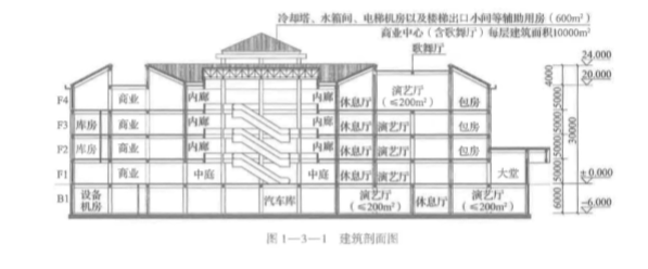 某商業(yè)中心地上 4 層,地下 I 層,耐火等級(jí)一級(jí),建筑屋面為坡屋面,建筑室外設(shè)計(jì)地 面至其檐口的高度為 20 m ,建筑室外設(shè)計(jì)地面至其屋脊的高度為 24 m,局部突出屋頂?shù)睦鋮s 塔、水箱間、電梯機(jī)房以及樓梯出口小間等輔助用房的建筑面積為 600 m2 ,每層建筑面積均為 10000 m2 ,并設(shè)置了防煙樓梯間、封閉樓梯間、室外疏散樓梯、電梯和自動(dòng)扶梯。該商業(yè)中心 按國(guó)家有關(guān)工程建設(shè)消防技術(shù)標(biāo)準(zhǔn)配置了自動(dòng)噴水滅火系統(tǒng)、火災(zāi)自動(dòng)報(bào)警系統(tǒng)和建筑滅火器 等消防設(shè)施及器材,相關(guān)信息如圖 1-3一l 所示。某歌舞廳位于該商業(yè)中心的地下一層至地上 四層,每層歌舞廳的廳、室總建筑面積均為 3000 m2 ,位于地下一層和地上四層的每個(gè)廳、室 的建筑面積均不大于 200 m20