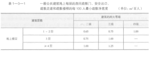 ( 10 )除劇場(chǎng)、電影院、禮堂、體育館外的其他公共建筑,其地上每層的房間疏散門(mén)、安 全出口、疏散走道和疏散樓梯的各自總凈寬度,應(yīng)根據(jù)疏散人數(shù)按每 100 人的最小疏散凈 寬度不小于表 1-3一1 的規(guī)定計(jì)算確定。當(dāng)每層疏散人數(shù)不等時(shí),疏散樓梯的總凈寬度可 分層計(jì)算,地上建筑內(nèi)下層樓梯的總凈寬度應(yīng)按該層及以上疏散人數(shù)最多一層的疏散人數(shù) 計(jì)算。