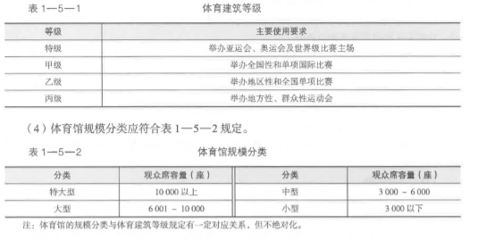 (一)體育建筑的等級(jí)和耐火等級(jí),體育館的規(guī)模分類 (1)體育建筑是指作為體育競(jìng)技、體育教學(xué)、體育娛樂(lè)和體育鍛煉等活動(dòng)之用的建筑物。 ( 2 )體育館是指配備有專門設(shè)備而供能夠進(jìn)行球類、室內(nèi)田徑、冰上運(yùn)動(dòng)、體操(技巧)、 武術(shù)、拳擊、擊劍、舉重、摔跤、 柔道等單項(xiàng)或多項(xiàng)室內(nèi)競(jìng)技比賽和訓(xùn)練的體育建筑,主要由 比賽和練習(xí)場(chǎng)地、看臺(tái)和輔助用房及設(shè)施組成。 體育館根據(jù)比賽場(chǎng)地的功能可分為綜合體育館 和專項(xiàng)體育館,不設(shè)觀眾看臺(tái)及相應(yīng)用房的體育館也稱訓(xùn)練房。 ( 3 )體育建筑等級(jí)應(yīng)根據(jù)其使用要求分級(jí),且應(yīng)符合表 1-5一1 的規(guī)定。