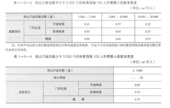 4) 體育館供觀眾疏散的所有內(nèi)門、外門、樓梯和走道的各自總凈寬度,應(yīng)根據(jù)疏散人數(shù) 按每 100 人的最小疏散凈寬度不小于表 }-5-3 、表 }-5-4 的規(guī)定計(jì)算確定。