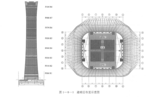 某市一棟地標性辦公樓地上 108 層、地下 7 層,建筑高度 428 m,總建筑面積 437000 m2 , 耐火等級一級,屋頂設有直升機停機坪,共設置 8 個避難層,避難層布置如圖 1-8-1 所示。 該辦公樓每層的每個防火分區(qū)均設置 1 臺消防電梯。該辦公樓按國家有關工程建設消防技術標 準配置了室內外消火栓系統(tǒng)、自動噴水滅火系統(tǒng)、火災自動報警系統(tǒng)和建筑滅火器等消防設施 及器材。