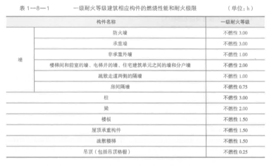 (1)地下或半地下建筑(室)和一類高層建筑及其裙房的耐火等級不應低于一級。 一級耐 火等級建筑相應構件的燃燒性能和耐火極限不應低于表 1-8一1 的規(guī)定。