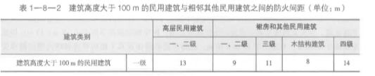 建筑高度大于 100m 的民用建筑與相鄰其他民用建筑的防火間距不應小于表 1-8-2 的 規(guī)定,且任何情況下均不應減小。