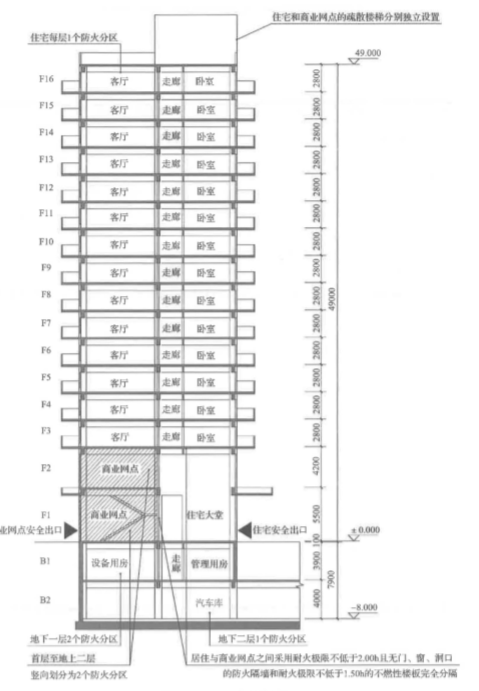 某塔式住宅建筑地上 16 層,地下 2 層,建筑高度 49 m,每層建筑面積均為 1 500 m2 ,框 架剪力墻結構;地下二層的使用功能為普通汽車庫,地下一層的使用功能為設備用房及管理用 房,首層及地上二層的使用功能為商業(yè)服務網(wǎng)點,地上 3 - 16 層的使用功能為居住部分。該 住宅建筑的居住部分與商業(yè)服務網(wǎng)點之間采用耐火極限不低于 2.00 h 且無門、窗、洞口的防火 隔墻和耐火極限不低于 1.50 h 的不燃性樓板完全分隔;住宅部分和商業(yè)服務網(wǎng)點部分的安全出 口和疏散樓梯分別獨立設置,住宅部分自地下二層至地上十六層設置一部剪刀樓梯間和兩部 消防電梯,商業(yè)服務網(wǎng)點中每個分隔單元均設有直通室外地平面的安全出口;商業(yè)服務網(wǎng)點中 每個分隔單元之間均采用耐火極限不低于 2.00 h 且元門、窗、洞口的防火隔墻相互分隔。該住 宅建筑的地下二層及居住部分的每層均分別劃分為 1 個防火分區(qū),地下一層劃分為 2 個防火分 區(qū),首層至地上二層豎向共劃分為 2 個防火分區(qū)。該建筑的相關信息如圖 1一10-1 所示。該 建筑按國家有關工程建設消防技術標準配置了室內(nèi)外消防給水系統(tǒng)、自動噴水滅火系統(tǒng)和建筑 滅火器等消防設施及器材。