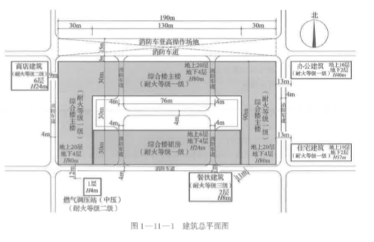 某棟綜合樓,地上 20 層,地下 4 層,建筑高度 80 m,采用框架剪力墻結(jié)構(gòu),總建筑面積 為 300000 m2 ; 該綜合樓內(nèi)的高層建筑主體與裙房之間設(shè)有防火墻,高層建筑主體的各層建筑 面積均大于 1000 m20 該綜合樓的建筑總平面布局等相關(guān)信息如圖 1-11一1 所示。該綜合樓 地下三、四層均為人防層,其平時的主要使用功能均為普通汽車庫、室內(nèi)有車道且有人員停留 的機械式汽車庫,和儲存可燃固體的丙類附屬庫房;地下二層的主要使用功能為展覽廳、管理 用房,及燃氣鍋爐房、柴油發(fā)電機房、變配電室、通風(fēng)空氣調(diào)節(jié)機房、消防水泵房等設(shè)備用 房;地下一層的主要使用功能為消防控制室、管理用房、電影院及商店營業(yè)廳。該綜合樓內(nèi)高 層建筑主體首層的主要使用功能為大堂、咖啡廳、自助餐廳、商店營業(yè)廳和展覽廳,地上二、 三層的主要使用功能均為兒童游樂廳、展覽廳、商店營業(yè)廳,地上 4 - 19 層的主要使用功能 均為辦公室,地上 20 層的主要使用功能為會議廳、多功能廳。該綜合樓內(nèi)裙房首層至地上六 層的主要使用功能均為商店營業(yè)廳。該建筑按國家有關(guān)工程建設(shè)消防技術(shù)標(biāo)準配置了室內(nèi)外消 火栓系統(tǒng)、自動噴水滅火系統(tǒng)、火災(zāi)自動報警系統(tǒng)和建筑滅火器等消防設(shè)施及器材。