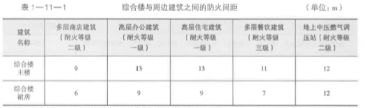 ( 2 )該綜合樓與周邊建筑之間的防火間距,不應(yīng)小于表 1一11一1 的規(guī)定。