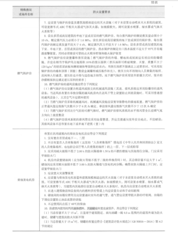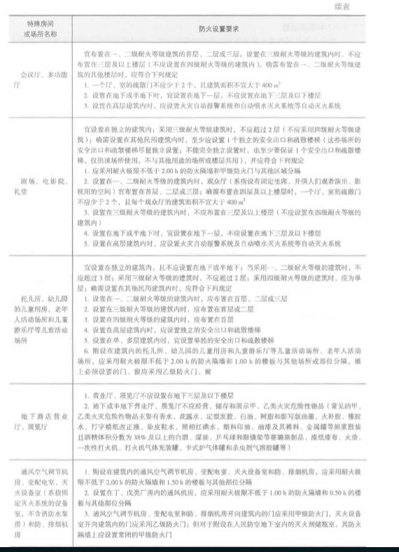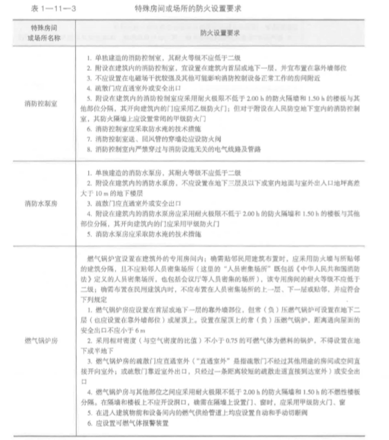 (四)特殊房間或場所的防火設(shè)置要求 根據(jù)《建筑設(shè)計防火規(guī)范~ (GB 50016-2014) 的規(guī)定,除為滿足民用建筑使用功能所設(shè) 置的附屬庫房外.民用建筑內(nèi)不應(yīng)設(shè)置生產(chǎn)車間和其他庫房。經(jīng)營、存放和使用甲、乙類火災(zāi) 危險性物品的商店、作坊和儲藏間,嚴禁附設(shè)在民用建筑內(nèi) o 該綜合樓內(nèi)消防控制室、消防水泵房、燃氣鍋爐房、柴油發(fā)電機房、會議廳、多功能廳、 電影院、兒童游樂廳、商店營業(yè)廳、展覽廳、自動滅火系統(tǒng)設(shè)備室、通風(fēng)空氣調(diào)節(jié)機房等特殊 房間或場所的有關(guān)防火設(shè)置要求應(yīng)符合表 l一 11-3 的規(guī)定。