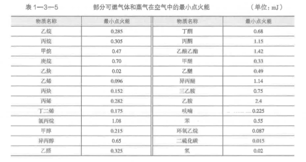 最小點(diǎn)火能是指在一定條件下,每一種爆炸油合物的起爆最小點(diǎn)火能。表 1-3-5 中列 出部分可燃?xì)怏w和蒸氣在一定條件下于空氣中的最小點(diǎn)火能。
