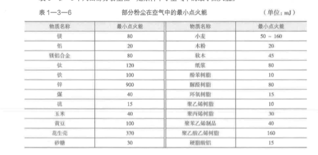 表 1-3-6 中列出部分粉塵在一定條件下手空氣中的最小點(diǎn)火能。