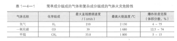 (2)一般來說,由簡單成分組成的氣體[如氫氣( H2 ) ]比復(fù)雜成分組成的氣體[如甲燒 (CH4 )、二氧化碳 (CO) 等]易燃,燃燒速度快,火焰溫度高,著火爆炸危險性大。簡單成分 氣體和復(fù)雜成分氣體的火災(zāi)危險性見表 1-4-10