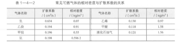 (2)比空氣重的氣體泄漏出來時往往飄浮于地表、溝渠、隧道、廠房死角等處,長時 間聚集不散,易與空氣在局部形成爆炸性混合氣體,遇引火源發(fā)生著火或爆炸;同時,密度大 的易燃?xì)怏w一般都有較大的發(fā)熱量,在火災(zāi)條件下易于使火勢擴(kuò)大。掌握氣體的相對密度及其 擴(kuò)散性,不僅對評價其火災(zāi)危險性具有實際意義,而且對選擇通風(fēng)門的位置、確定防火間距 及采取防止火勢蔓延的措施都具有實際意義。常見可燃?xì)怏w的相對密度與擴(kuò)散系數(shù)的關(guān)系見 表 1-4-20