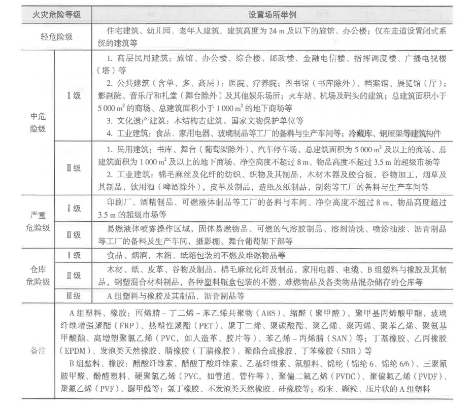 自動噴水滅火系統(tǒng)設(shè)置場所的火災(zāi)危險等級共分為 4 類 8 級,即輕危險級、中危險級