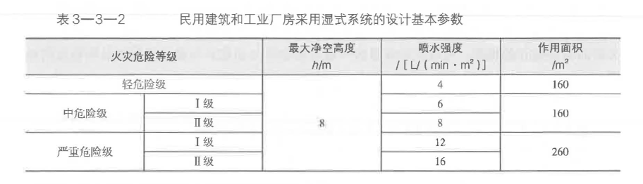 對于民用建筑和工業(yè)廠房,采用溫式系統(tǒng)的設(shè)計基本參數(shù)應(yīng)符合表 3-3-2 的規(guī)定。僅在 走道設(shè)置灑水噴頭的閉式系統(tǒng),其作用面積應(yīng)按最大疏散距離所對應(yīng)的走道面積確定;在裝有 網(wǎng)格、柵板類通透性吊頂?shù)膱鏊到y(tǒng)的噴水強(qiáng)度應(yīng)按表 3-3-2 規(guī)定值的1.3 倍確定;干式 系統(tǒng)的作用面積按表 3-3-2 規(guī)定值的1.3倍確定。系統(tǒng)最不利點(diǎn)處噴頭的工作壓力不應(yīng)低于0.05 MPa。