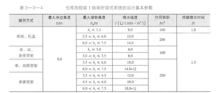 (1)倉庫危險級 I 級場所溫式系統(tǒng)的設(shè)計基本參數(shù)?;馂?zāi)危險等級為倉庫危險級 I 級的儲存?zhèn)}庫及類似場所,采用溫式系統(tǒng)時,其設(shè)計基本參數(shù)應(yīng)符合表 3-3-4 的規(guī)定。