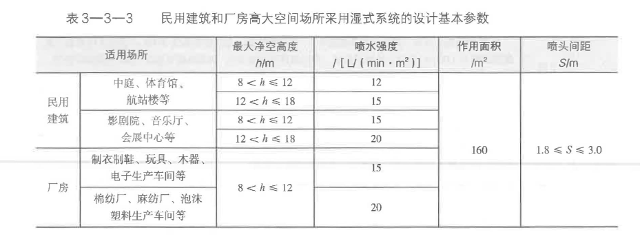 民用建筑和廠房高大空間場所采用的溫式系統(tǒng),其設(shè)計基本參數(shù)應(yīng)符合表 3-3-3 的規(guī) 定。表中未列入的場所,應(yīng)根據(jù)該表規(guī)定場所的火災(zāi)危險性類比確定。當(dāng)民用建筑高大空間場 所的最大凈空高度為 12 m < h"三 18 m 時,應(yīng)采用非倉庫型特妹應(yīng)用噴頭。最大凈空高度超過 8m 的超級市場采用的濕式系統(tǒng),其設(shè)計基本參數(shù)應(yīng)按倉庫濕式系統(tǒng)設(shè)計基本參數(shù)執(zhí)行。