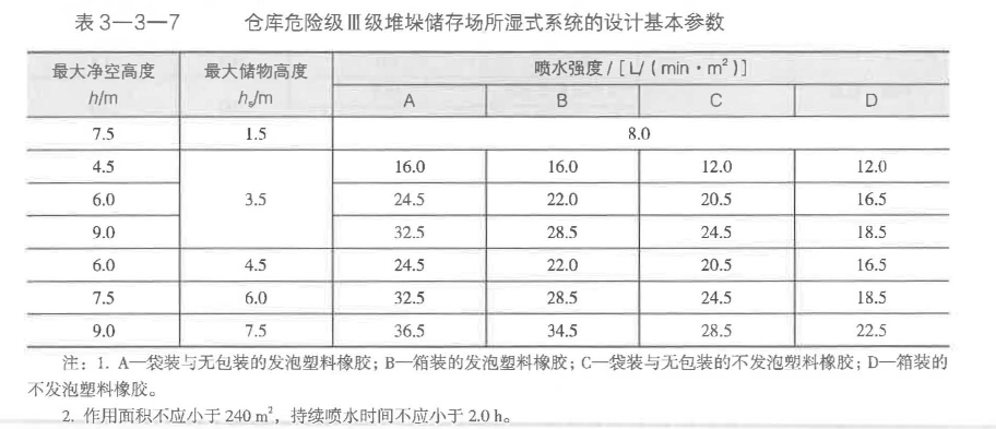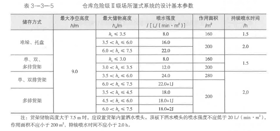 (2)倉庫危險級 E 級場所濕式系統(tǒng)的設(shè)計基本參數(shù)?;馂?zāi)危險等級為倉庫危險級 E 級的儲 存?zhèn)}庫及類似場所,采用濕式系統(tǒng)時,其設(shè)計基本參數(shù)應(yīng)符合表 3-3-5 的規(guī)定。