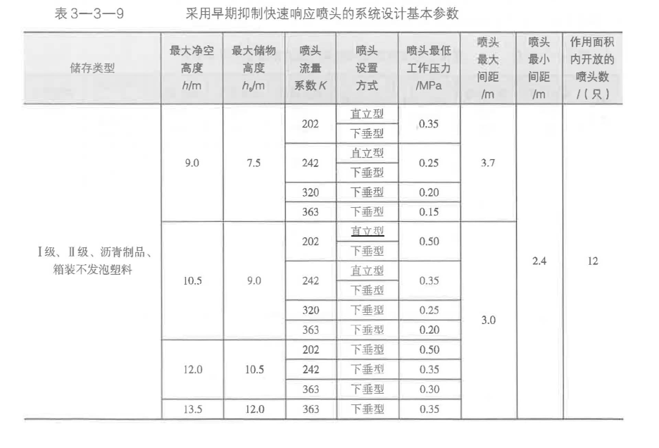 ( 5 )采用早期抑制快速響應(yīng)噴頭的系統(tǒng)設(shè)計基本參數(shù)。倉庫和類似場所采用早期抑制快速 響應(yīng)噴頭時\系統(tǒng)的設(shè)計基本參數(shù)不應(yīng)低于表 3-3-9 的規(guī)定。