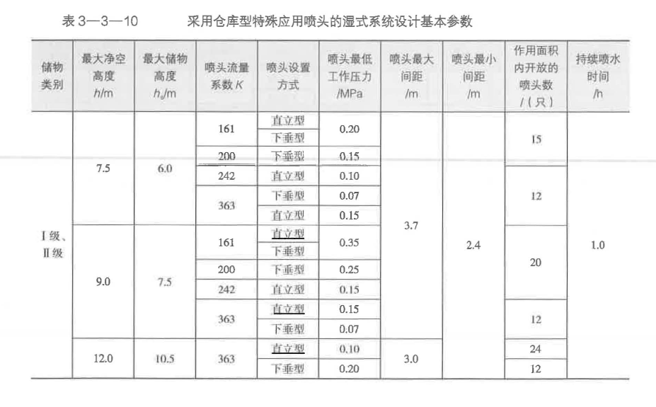 (6) 采用倉庫型特殊應(yīng)用噴頭的瘟式系統(tǒng)設(shè)計基本參數(shù)。倉庫和類似場所采用倉庫型特殊應(yīng)用噴頭時,濕式系統(tǒng)的設(shè)計基本參數(shù)不應(yīng)低于表 3-3-10 的規(guī)定。