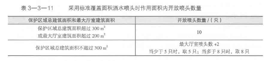 (1)采用標(biāo)準(zhǔn)覆蓋面積灑水噴頭的系統(tǒng)。采用標(biāo)準(zhǔn)覆蓋面積灑水噴頭的系統(tǒng),噴頭的 布置應(yīng)符合輕危險級或中危險級 I 級場所的有關(guān)規(guī)定,作用面積內(nèi)開放的噴頭數(shù)量應(yīng)符合 表 3-3-11 的規(guī)定 。