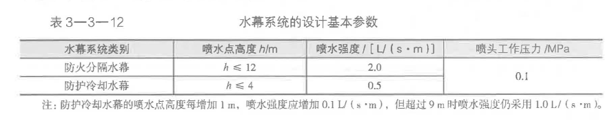 水幕系統(tǒng)的設(shè)計基本參數(shù)應(yīng)符合表 3-3 一 12 的規(guī)定。當(dāng)采用防護(hù)冷卻系統(tǒng)保護(hù)防火卷 簾、防火玻璃墻等防火分隔設(shè)施時,系統(tǒng)應(yīng)獨(dú)立設(shè)置,噴頭設(shè)置高度不應(yīng)超過 8 m; 當(dāng)設(shè)置高 度為 4 - 8 m 時,應(yīng)采用快速響應(yīng)灑水噴頭;噴頭設(shè)置高度不超過 4m 時,噴水強(qiáng)度不應(yīng)小于0.5 U (S ? m) ;當(dāng)超過 4m 時,每增加 1 m ,噴水強(qiáng)度應(yīng)增加 0.1 11 ( S ? m) ;噴頭的設(shè)置應(yīng)確 保噴灑到被保護(hù)對象后布水均勻,噴頭間距應(yīng)為1. 8 - 2.4 m; 噴頭濺水盤與防火分隔設(shè)施的水平距離不應(yīng)大于 0.3 m ,與頂板的距離應(yīng)符合國家消防技術(shù)標(biāo)準(zhǔn)和規(guī)范的要求;持續(xù)噴水時間 不應(yīng)小于系統(tǒng)設(shè)置部位的耐火極限要求。