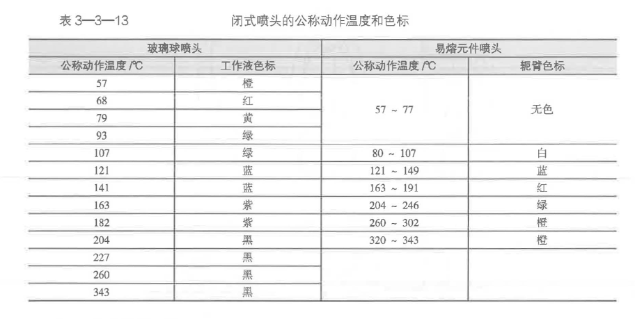 根據(jù)《自動(dòng)噴水滅火系統(tǒng)第1部分:灑水噴頭》(GB5135.1-2003),玻璃球噴頭的公稱動(dòng)作溫度分為13個(gè)溫度等級(jí),易熔元件噴頭的公稱動(dòng)作溫度分為7個(gè)溫度等級(jí)。為了區(qū)分不同公稱動(dòng)作溫度的噴頭,將感溫玻璃球中的液體和易熔元件噴頭的輒臂標(biāo)示為不同的顏色,見表3-3-13。