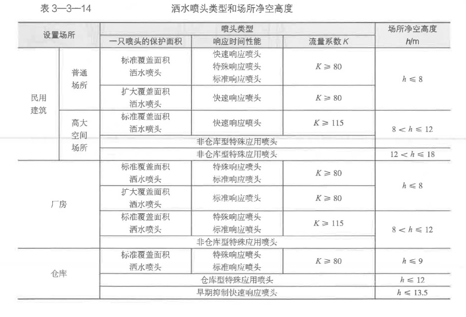 設(shè)置閉式系統(tǒng)的場(chǎng)所,所選噴頭的類型和場(chǎng)所的最大凈空高度應(yīng)符合表3-3一14的規(guī)定,但僅用于保護(hù)室內(nèi)鋼屋架等建筑構(gòu)件的灑水噴頭和貨架內(nèi)置灑水噴頭,可不受此表規(guī)定的限制。閉式系統(tǒng)噴頭的公稱動(dòng)作溫度宜高于環(huán)境最高溫度300C。