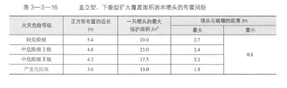 (2)直立型、下垂型擴(kuò)大覆蓋面積灑水噴頭的布置。直立型、下垂型擴(kuò)大覆蓋面積灑水噴頭應(yīng)采用正方形布置,其布置間距不應(yīng)大于表3-3一16的規(guī)定,且不應(yīng)小于2.4m。