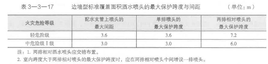 (3)邊墻型標(biāo)準(zhǔn)覆蓋面積灑水噴頭的布置。邊墻型標(biāo)準(zhǔn)覆蓋面積灑水噴頭的最大保護(hù)跨度與間距應(yīng)符合表3-3一17的規(guī)定。
