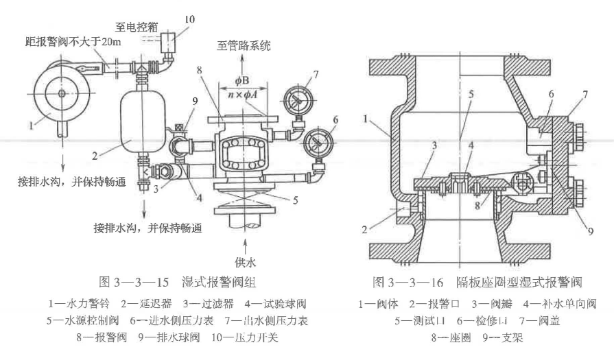 (1)濕式報(bào)警閥組的組成。濕式報(bào)警閥是濕式系統(tǒng)的專用閥門,是只允許水流入系統(tǒng),并在規(guī)定壓力、流量下驅(qū)動(dòng)配套部件報(bào)警的一種單向閥。1顯式報(bào)警閥組的主要元件為止回閥,其開啟條件與入口壓力及出口流量有關(guān),它與延遲器、水力警鈴、壓力開關(guān)、控制閥等組成報(bào)警閥組,如圖3-3-15所示。
