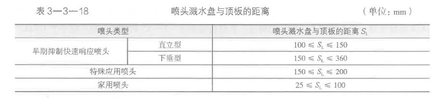(5)直立型、下垂型早期抑制快速響應(yīng)噴頭、特殊應(yīng)用噴頭和家用噴頭的布置。除吊頂型灑水噴頭及吊頂下設(shè)置的灑水噴頭外,直立型、下垂型早期抑制快速晌應(yīng)噴頭、特殊應(yīng)用噴頭和家用噴頭濺水盤與頂板的距離應(yīng)符合表3-3-18的規(guī)定。